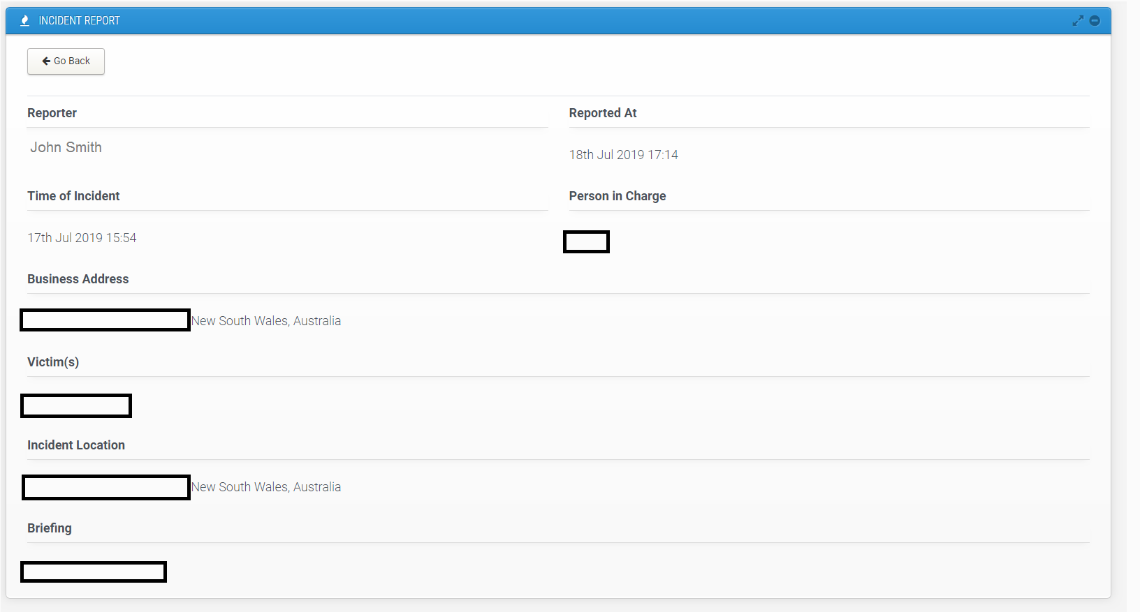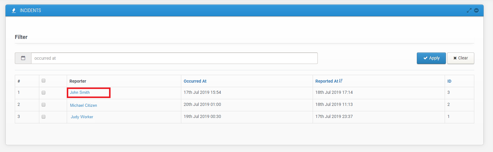 Then you can view a particular incident by click on reporters name.